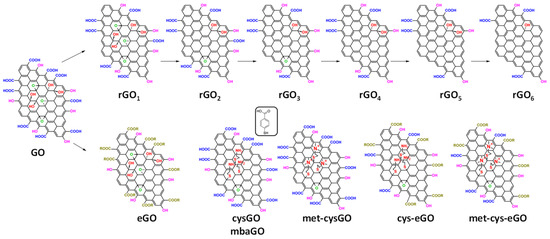 The synthetic name and the schematic chemical structure of GO and the GO-derived compounds studied in this work are summarized below (see Scheme 1):