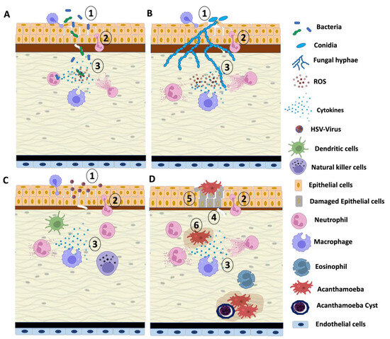 Schematic of pathophysiology of infectious keratitis. (A) bacterial keratitis, (B) fungal keratitis, (C) viral keratitis and (D) parasitic keratitis. In case of bacterial and fungal infection, microorganisms enter the corneal epithelial cell through injury or trauma. In response to infection and injury, the immune cells infiltrate, and cytokines and chemokines are subsequently secreted by the injured epithelial cells and immune cells. However, in case of viral infection, viruses bind the cell surface receptors of corneal epithelial cells and invade the stroma. Parasitic pathogens like Acanthamoeba damage the cornea by entering through various means, form cysts, and cause stromal dissolution leading to irreversible corneal damage; 1 corneal epithelial barrier breakdown, 2 cellular infiltration, 3 cytokines and chemokines secretion, 4 thinning and breakdown of Bowman’s layer, 5 corneal epithelial cell damage, 6 stromal dissolution.