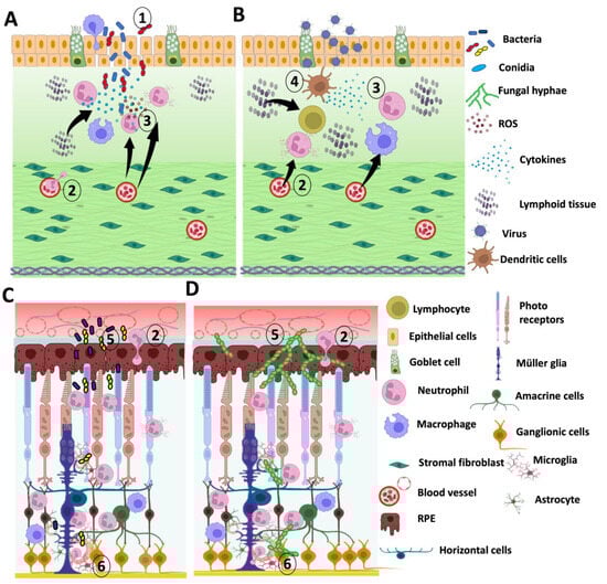 Schematic of pathophysiology of infectious conjunctivitis and endophthalmitis. (A) Bacterial conjunctivitis: It starts with the colonization of bacteria on the of disrupted epithelial cells by injury or trauma. In response to infection and injury, the immune cells infiltrate and cytokines and chemokines are subsequently secreted by the injured epithelial cells and immune cells. (B) Viral conjunctivitis: Virus binds the cell surface receptors and internalizes conjunctival epithelial cells and invades stroma. Goblet cells are also involved in the internalization in viral conjunctivitis. Both the innate and adaptive immune responses get activated against viral infection and secret cytokines and chemokines. (C) Bacterial endophthalmitis, and (D) Fungal endophthalmitis: Both bacterial and fungal endophthalmitis can originate from exogenous or endogenous sources of microorganisms. Exogenous endophthalmitis occurs when organisms enter the eye through intraocular surgery, penetrating trauma, or by spreading from adjacent tissues. In contrast, endogenous endophthalmitis occurs when infectious agents are carried to the eye through the bloodstream from a distant site of infection. This leads to blood retinal barrier breakdown, immune cells infiltration and microglia activation. The infiltered immune cells and activated microglia secret cytokines and chemokines and cause inflammation and neurodegeneration; 1 represents conjunctival epithelial barrier breakdown, 2 represents cellular infiltration, 3 represents cytokines and chemokines secretion, 4 represents activation of lymphocyte, 5 represents blood-retinal barrier breakdown, 6 represents activation of microglia.