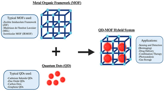 Figure 1. Comprehensive representation of typical MOFs and QDs used and their applications as a hybrid system (Created in BioRender. Kim, K. (2025), https://BioRender.com/8w47vhy, accessed on 14 March 2025).