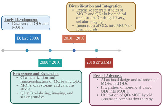 Figure 2. Historical timeline QDs, MOFs, and their integration into the QD–MOF hybrids, highlighting evolution and key development in the field (Created in BioRender. Kim, K. (2025), https://BioRender.com/my54ifg, accessed on 21 April 2025).