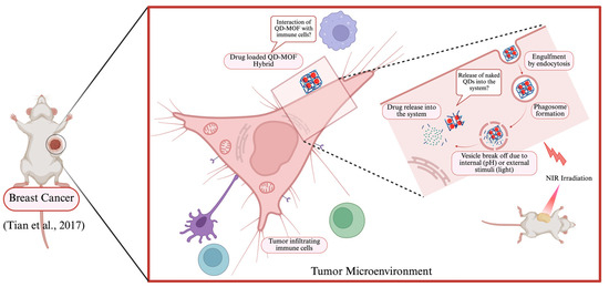 Figure 3. A representative illustration of QD–MOF hybrid drug delivery in cancer therapeutics using the study by Tian et al., 2017 [83] (Created in BioRender. Kim, K. (2025), https://BioRender.com/cnsho97, accessed on 21 April 2025).