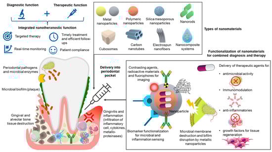 Periodontitis is a chronic, multifactorial inflammatory disease characterized by the progressive destruction of the tooth-supporting structures. Conventional therapeutic approaches, including mechanical debridement and systemic antibiotics, often fall short in achieving complete bacterial eradication or tissue regeneration, particularly in deep periodontal pockets. Nanotheranostics—an integrated platform combining diagnostics and therapeutics within a single nanosystem—holds promise in advancing periodontal care through targeted delivery, real-time disease monitoring, and site-specific therapy. This narrative review examines the potential of various nanomaterials for building nanotheranostic systems to overcome current clinical limitations, including non-specific drug delivery, insufficient treatment monitoring, and delayed intervention, and their functionalization and responsiveness to the periodontal microenvironment are discussed. Their application in targeted antimicrobial, anti-inflammatory, and regenerative therapy is discussed in terms of real-time monitoring of disease biomarkers and pathogenic organisms. Although nanoparticle-based therapeutics have been extensively studied in periodontitis, the integration of diagnostic elements remains underdeveloped. This review identifies key translational gaps, evaluates emerging dual-function platforms, and discusses challenges related to biocompatibility, scalability, and regulatory approval. In particular, inorganic nanomaterials exhibit potential for theranostic functions such as antimicrobial activity, biofilm disruption, immunomodulation, tissue regeneration, and biosensing of microbial and inflammatory biomarkers. Finally, we propose future directions to advance nanotheranostic research toward clinical translation. By consolidating the current evidence base, this review advocates for the development of smart, responsive nanotheranostic platforms as a foundation for personalized, minimally invasive, and precision-guided periodontal care. Full article