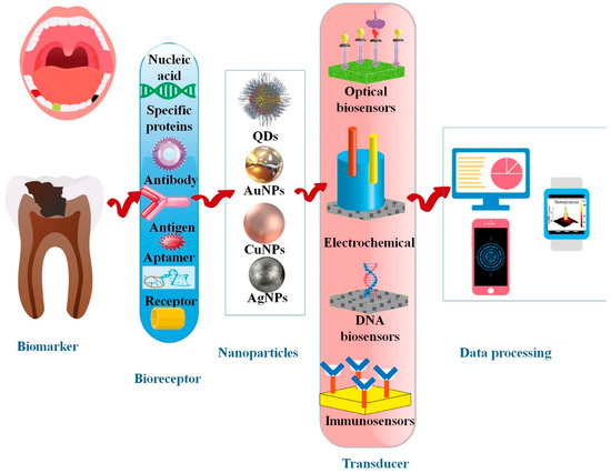 Periodontitis may be detected using various platforms, including those based on electricity, DNA, immunosensors, electrochemistry, and optics. Nanomaterials are often used as transducer materials, playing a crucial role in advancing biosensors. A biosensor has four essential components: A bioreceptor, a transducer, a signal processor for transforming electrical signals into the required form, and an interface for displaying the results. Various metal nanoparticles, including AuNPs and AgNPs, as well as diverse forms of graphene oxide, carbon dots, and quantum dots, are synthesized using easy techniques and serve as distinct nanoplatforms for detecting circulating biomarkers. Reproduced from [6]; Creative Commons Attribution 4.0 International CC BY 4.0 Licence.