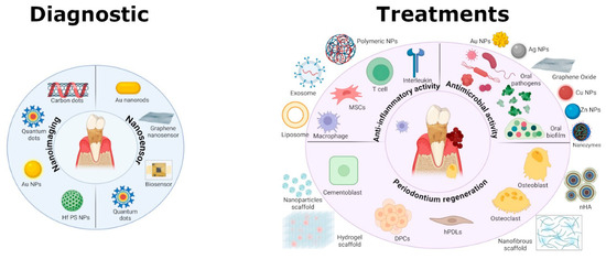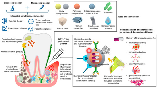 Nanotechnology offers innovative solutions for overcoming the limitations of conventional periodontal therapy. Owing to their tunable size, surface characteristics, and multifunctionality, nanomaterials can be engineered for targeted drug delivery, deep penetration into periodontal pockets, and controlled release in response to environmental cues. Theranostic nanoplatforms, which integrate diagnostic and therapeutic functionalities within a single system, represent a promising frontier for personalized and precise periodontal care. These platforms enable early detection of disease biomarkers (such as matrix metalloproteinases, inflammatory cytokines and host-derived enzymes), localized treatment with antibiotics and other anti-inflammatories, and real-time monitoring of the therapeutic response and disease progression [9].