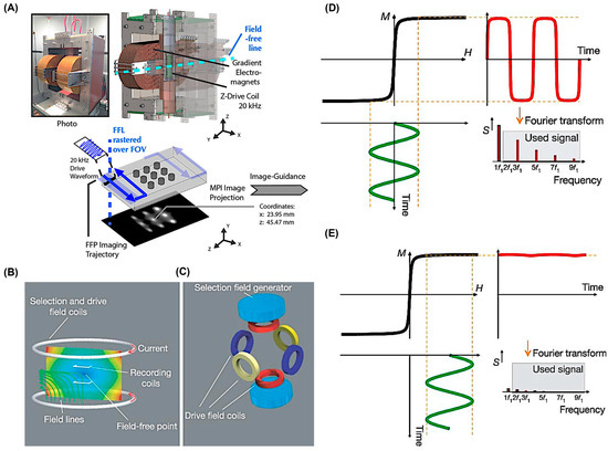 MPI, first introduced in 2005, is an innovative imaging technology fundamentally linked to specific magnetic phenomena such as magnetic field gradients, the non-linear magnetization behavior of materials, and their saturation characteristics (Figure 1A) [,]. At its core, MPI operates by detecting the magnetic response of superparamagnetic iron oxide nanoparticles (SPIONS) after they are exposed to a rapidly oscillating magnetic drive field with sufficient energy. This induced magnetization is picked up by inductive receiver coils, and the resulting signal is interpreted through Faraday’s law. The detected signal contains not only the primary drive frequency but also a series of harmonic frequencies, which are crucial for image formation and are separated using appropriate filtering during the signal reconstruction phase. A critical aspect of MPI is overcoming the suppression of harmonic generation in strong, time-constant magnetic fields, a phenomenon known as magnetic saturation [,]. To circumvent this, a high-magnitude static magnetic gradient, typically ranging from approximately 1 to 7 T (μ0−1 m−1), is precisely superimposed. This creates a “Field Free Point” (FFP) (Figure 1B,C) or a “Field Free Line” (FFL) region where the magnetic field is effectively zero [,]. These FFPs or FFLs are then systematically shifted along a predefined scan trajectory to cover the entire imaging field of view (Figure 1A) []. As the FFP/FFL traverses through a sample containing nanoparticles, the distinct magnetic responses between the magnetically saturated (or semi-saturated) regions and the fully unsaturated (zero-field) regions enable the spatial encoding necessary for image reconstruction. The final images are generated using sophisticated visualization algorithms, primarily via two methods: either through a pre-obtained system matrix dataset, which maps the magnetic response of a single particle across every imaging voxel, or by the x-space method, which directly correlates the instantaneous signal obtained with the real-time location of the FFP/FFL (Figure 1D,E) [].