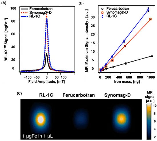 A wide range of magnetic nanoparticles has been introduced into the market and subsequently explored as tracers for MPI. Interestingly, most of these particles were not originally designed for MPI but for other biomedical purposes, including iron supplementation therapies and magnetic resonance imaging (MRI) contrast enhancement. As a result, their performance in MPI is often less than ideal, although they are still widely employed as reference standards for evaluating the sensitivity and efficiency of newly developed tracers. One of the earliest examples is Resovist, a carboxydextran-stabilized magnetite formulation that received clinical approval as an MRI agent [,]. While its superparamagnetic iron oxide cores are relatively small (3–5 nm), particle–particle interactions create a fraction of effectively larger magnetic domains (25–30 nm), which enhances its MPI signal []. A related formulation, Ferucarbotran, has the same composition as Revovist and is marketed off-label, while VivoTrax represents a rebranded version of ferucarbotran sold specifically for MPI applications [].