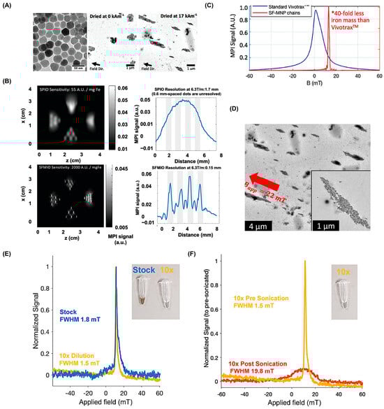 A novel approach to tracer design has recently emerged, utilizing strong magnetic dipole–dipole interactions between particles that align to form nanoparticle chains in fluid under the influence of an external magnetic field. This self-assembly process significantly amplifies the local magnetic field by nearly an order of magnitude, leading to much sharper PSFs. Using this strategy, Tay and colleagues reported remarkable enhancements, including up to a 40-fold increase in sensitivity and a tenfold improvement in spatial resolution, which theoretically enables real-time tracking of individual cells in vivo (Figure 3A–C) []. Subsequent investigations into this “chaining hypothesis” have focused on factors that regulate the dynamics of chain formation. For instance, Fung and co-workers emphasized that rapid chain assembly requires low-viscosity environments since higher viscosities hinder particle mobility and elevated nanoparticle concentrations, which minimize inter-particle distances and promote efficient dipole interactions (Figure 3D) []. They tested this by diluting and sonicating polarized SFMIOs. After a 10-fold dilution, they still showed superferromagnetism (Figure 3E), indicating that chains remain intact despite dilution. If dissolution had occurred, this behavior would not be observed. In contrast, sonication restored superparamagnetism (Figure 3F), confirming chain breakage. Since sonication applies strong localized energy via cavitation, such dissolution is unlikely during MPI scans. The behavior of chain-like tracers has been further explored through computational modeling. Zhao and colleagues used simulations to examine how magnetic dipole–dipole interactions influence both MPI performance and the dynamic magnetization of particles arranged in chains []. Their findings revealed that chains containing two or more nanoparticles can significantly improve signal strength and resolution, consistent with experimental reports by Tay et al. []. Moreover, the study highlights a broad design space for optimizing MPI tracers by adjusting factors such as chain length, interparticle spacing, nanoparticle composition, and solution viscosity. Novel designs like iron oxide nanochains (FeONCs), optimized for breast cancer imaging, further outperform spherical, cubic, and nanoworm tracers in terms of magnetic properties, were reported by Kumar et al. []. Magnetic relaxometry confirms FeONCs offer superior sensitivity compared to standard tracers such as VivoTrax, Synomag D50 and D70.