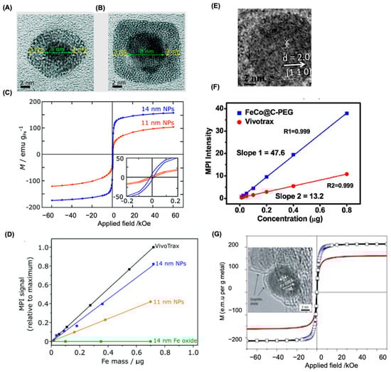 Alternative structures for MPI application. (A,B) High-resolution transmission (HR-TEM) microscopy images for core–shell FeONPs with diameters of 11 and 14 nm, respectively. (C) Magnetic hysteresis curves showing the field-dependent magnetism of Core-shell nanoparticles at 300 K. (D) Plot of MPI signals relative to commercial VivoTrax as a function of Fe mass in the core–shell NPs. (E) Magnetization field measurements at room temperature on FeCo/graphitic-shell nanocrystals of approximately 7 nm (black curve) and 4 nm (red curve) soon after synthesis. For the ~7 nm nanocrystals, additional data collected after one month of exposure to ambient conditions (blue markers) showed no noticeable change compared to the initial results (solid black curve). The absence of hysteresis in the solid curves, obtained by cycling the magnetic field, confirms the superparamagnetic behavior of these nanocrystals. Inset shows the HRTEM images for nanocrystals. (F) HRTEM images for carbon-coated FeCo nanoparticles. (G) MPI response for carbon-coated FeCo nanoparticles and VivoTrax with varying Fe content. Reproduced with permission from Ref. []. Copyright 2020 RSC and from Refs. [,]. Copyright 2006, 2020 Nature.