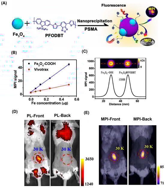 Application of MPI for cell tracking and mutimode imaging. (A) A schematic for the preparation of FeONPs tracer with multimode imaging capability. (B) MPI signal intensity comparison for Fe3O4–COOH and VivoTrax for varying Fe concentration in water. (C) Two-dimensional projection MPI was performed on Fe3O4–COOH and Fe3O4@PFODBT-COOH samples, each containing 8 μg of iron dispersed in 200 μL of water. (D) Fluorescence imaging of mice captured from both anterior and posterior views following subcutaneous administration of Fe3O4@PFODBT-COOH–tagged cells (excitation at 540 nm, emission at 680 nm). (E) Corresponding two-dimensional projection MPI scans from the same front and back perspectives after injection of the labeled cells. Reproduced with permission from Ref. []. Copyright 2017 American Chemical Society.