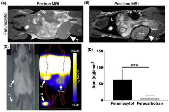 MRI and MPI visualization of tumor-associated macrophages (TAMs). (A) Pre-injection MRI of mice prior to systemic administration of Ferumoxytol (0.5 mmol/kg). (B) Post-injection MRI (24 h) showing signal voids within the tumor region, indicating TAM-mediated iron uptake. White arrowheads point to tumors. (C) MPI at 24 h revealed tumor-associated Ferumoxytol signals, though spatial resolution was limited compared to Ferucarbotran-based MPI. The white arrows indicate fiducials, and tumor in the right mammary fat pad. (D) Ex vivo MPI confirmed higher iron accumulation in metastatic lungs than in controls, verifying TAM targeting. Where SP: Spleen, L: Liver, T: Tumor, and Fid: Fiducial markers. The study highlights differences in imaging performance between MRI and MPI using iron-based tracers. Where *** p < 0.0001. Reproduced with permission from Ref. []. Copyright 2020 Springer.