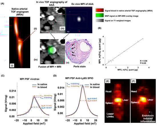 (A) In vivo MRI and ex vivo MPI imaging of inflammatory activity during abdominal aortic aneurysm (AAA) progression. (i) Time-of-flight angiogram of the suprarenal abdominal aorta in a male ApoE−/− mouse after four weeks of angiotensin II infusion. (ii) T1-weighted MRI revealed clear dilation of the aortic lumen. (iii) Ex vivo MPI of the same animal showing the AAA region. (iv) Fused ex vivo MPI and in vivo MRI images, aligned using anatomical landmarks. (v) Histological validation using Perls’ Prussian Blue staining, confirming iron accumulation (black arrows) (scale bar: 100 μm). Abbreviations: (TOF) time-of-flight; (MRA) magnetic resonance angiography; (MNP) magnetic nanoparticles. (B) Comparison between ex vivo magnetic particle spectroscopy (MPS) and magnetic particle imaging (MPI) for quantifying iron oxide nanoparticles. A strong linear relationship (R = 0.99) was observed between the iron content measured by MPS and MPI, confirming the accuracy and reliability of MPI-based quantification. (C,D) represents the PSF function for VivoTrax and Anti-Ly6G SPION in different conditions. Anterior–posterior maximum intensity projection images derived from 3D MPI data obtained 24 h after administering the anti-Ly6G antibody–conjugated SPIO tracer in (E) a healthy mouse and (F) a mouse with LPS-induced myositis in the right leg. Reproduced with permission from Refs. [,]. Copyright 2021 Ivyspring and copyright 2020 Nature, respectively.
