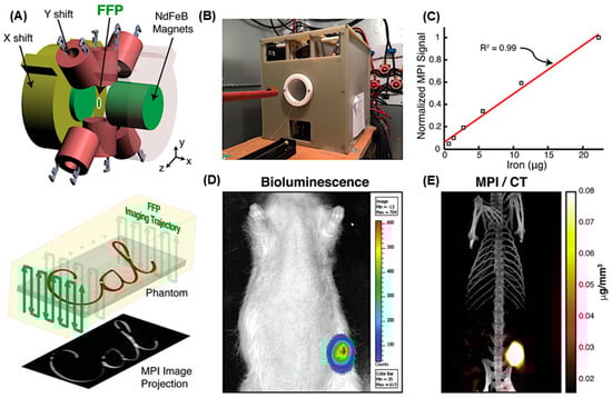 In vivo tumor imaging applications (A) Schematic representation of field-free point (FFP) magnetic particle imaging. A magnetic field gradient is generated using NdFeB permanent magnets (green), while electromagnets (yellow and red) shift the FFP along the x- and y-axes. Motion of the animal bed along the z-axis is controlled by a motor, enabling the FFP to traverse the sample within the field of view and produce a 3D MPI dataset. A maximum intensity projection of the reconstructed 3D image is displayed. (B) Photograph of the custom-designed FFP MPI scanner. (C) Quantitative MPI response of LS-008 superparamagnetic iron oxide (SPIO) nanoparticles (Lodespin Labs) at concentrations from 36 μg Fe/mL to 1.2 mg Fe/mL, demonstrating a linear correlation between SPIO concentration and MPI signal (R2 = 0.99). (D) Bioluminescence image of an MDA-MB-231-luc xenograft tumor. (E) Corresponding maximum intensity projection of the MPI scan (field of view: 4 × 4 × 5.8 cm) acquired 6 h after intravenous injection of LS-008 particles, shown with CT overlay of the lower abdomen. Reproduced with permission from Ref. []. Copyright 2017 American Chemical Society.
