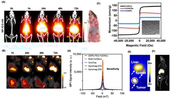 Kumar et al. fabricated iron oxide nanochains (FeONCs) with an average core diameter of 17.4 nm as an MPI tracer for addressing the current limitations in terms of sensitivity and resolution (Figure 9C inset) []. Superconducting Quantum Interference Device magnetometry measurements confirmed the superparamagnetic nature of FeONCs, a prerequisite for MPI tracers, with a saturation magnetization of 144.34 emu/g, significantly higher than FeONPs (33.56 emu/g) and FeO nanocubes (68.28 emu/g) (Figure 9C). This increased magnetic moment enhances their ability to respond quickly and effectively to magnetic fields, making them ideal for MPI. Magnetic relaxometry studies indicated that FeONCs provided significantly higher signal intensity than commercially available tracers like VivoTrax (4.3 times higher), Synomag-D-70 (2.03 times higher), and Synomag-D50 (1.56 times higher) (Figure 9D). Cell viability studies using 4T1 breast cancer cells and mesenchymal stem cells showed no toxicity at concentrations up to 100 μg/mL of FeONCs with DSPE-PEG and RGD on their surfaces. In vivo experiments using orthotopic breast cancer mouse models demonstrated that RGD-based FeONCs accumulated in the tumor region earlier and with enhanced MPI signals compared to non-RGD and control spherical FeONPs and a clear anatomical feature co-registered with CT allowed early detection and tracking of breast cancer (Figure 9E,F).