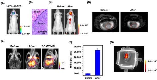 Multimodal imaging of orthotopic brain tumor–bearing mice. (A) Representative bioluminescence image of mice implanted with U87-luciferase glioma cells. (B) H&E-stained brain section confirming tumor presence. Multimodal imaging performed before and 24 h after intravenous administration of MMPF NPs (2 mg/kg): (C) fluorescence images, (D) T2-weighted MRI images, (E) 3D MPI/CT fusion images of the mouse head pre- and post-injection, and (F) quantitative comparison of MPI signal intensity in brain regions. (G) Ex vivo fluorescence image of the excised brain showing red fluorescence from accumulated MMPF NPs. Reproduced with permission from Ref. []. Copyright 2019 American Chemical Society.