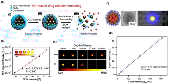 Drug delivery applications. (A) Schematic of Fe3O4@PLGA nanocomposites for MPI-guided drug release. (i) Fe3O4 nanoparticles (brown) encapsulated in a PLGA shell (blue) are loaded with DOX (red). (ii) In acidic conditions, the PLGA degrades, leading to DOX release and Fe3O4 core disassembly. (iii) Core clustering reduces the MPI signal, while gradual disassembly enhances it, enabling quantitative monitoring of drug release. (B) Relationship between the percentage of DOX released and corresponding MPI signal intensity. A strong linear correlation was observed, with R2 = 0.99. Inset: Representative MPI scans of samples incubated in phosphate buffer (pH 6.5) at varying time intervals, displayed using pseudocolor mapping. (C) Depth penetration comparison of MPI and fluorescence using Cy5.5. Conjugated SPIONS loaded with Cy5.5 were placed in a 96-well plate and sequentially covered with chicken breast tissues of varying thickness. MPI and FI measurements were performed at each depth, with corresponding signal intensities displayed in pseudocolor. (D) Schematic and representation for the SPIONS loaded with DOX, and TEM images showing the protective PEG layer loaded with SPION-DOX. MPI images for the SPIONS loaded with DOX. (E) Quantitative MPI analysis of doxorubicin-loaded nanocarriers. Reproduced with permission from Ref. []. Copyright 2019 American Chemical Society and from Ref. []. Copyright 2019 Elsevier.