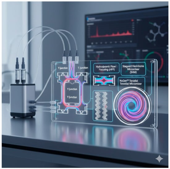 Bahlool et al. [11], designed an inhalable all-trans retinoic acid (ATRA)-loaded poly(lactic-co-glycolic acid) (PLGA) nanoparticle formulation that reduced bacterial load in infected alveolar cells in a dose-dependent manner while maintaining cell viability. The formulation shows suitable aerodynamic properties for alveolar targeting. On the other hand, scaling up nanoformulations remains challenging due to poor reproducibility and limited batch size in conventional nanoprecipitation or emulsion methods [12]. To address this, Bahlool et al. [11], used microfluidics for continuous, scalable nanoparticle production. This method ensures controlled mixing at the nanoliter scale, user-independent operation, and high reproducibility. Microfluidic systems typically include a pump and a chip with mixers, such as T-junctions, HFFs, SHMs, and newer NxGen™ toroidal micromixers (Figure 2).