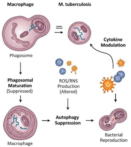 On the other hand, M. tuberculosis, the causative agent of tuberculosis disease, makes macrophages the primary immune responders and host cells. After macrophages take up M. tuberculosis, their natural ability to fight off microbes is suppressed, allowing the bacterium to live and reproduce within them. The mechanisms by which M. tuberculosis suppresses the antimicrobial response of the macrophage include limiting phagosomal maturation and modulating cytokine, reactive oxygen, and nitrogen species (ROS/RNS) production, and suppressing autophagy (Figure 4) [43]. This suppression of macrophage defense responses is essential for the pathogen to survive and replicate within cells. However, blocking some of the mechanisms that M. tuberculosis uses to survive in macrophages could lead to the development of therapeutic strategies for treating TB. That is the field addressed by host-directed therapies (HDTs).