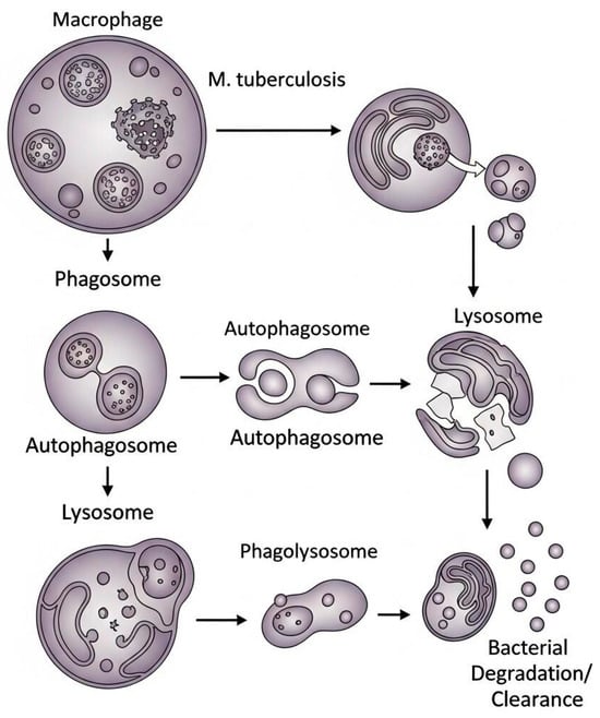 The process of autophagy is responsible for the lysosomal degradation of intracellular components, including invading pathogens such as M. tuberculosis [7]. In macrophages infected with M. tuberculosis, the induction of autophagy causes the maturation of phagosomes containing M. tuberculosis, which subsequently fuse with lysosomes to clear the bacteria (Figure 5) [63].