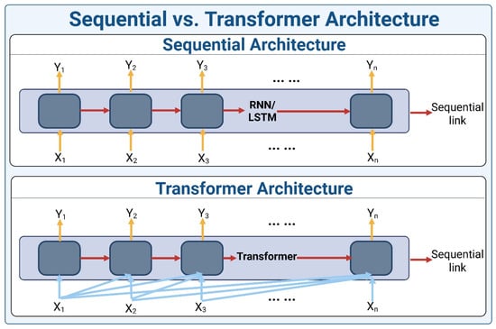Comparison between sequential and Transformer architectures. In sequential models (top), such as RNNs or LSTMs, inputs are processed one at a time, with information propagated step by step, which limits parallelism and the modeling of long-range dependencies. In contrast, Transformer architectures (bottom) use self-attention to model relationships among all tokens in the input sequence simultaneously. This enables efficient parallel computation and superior performance in capturing global contextual dependencies.
