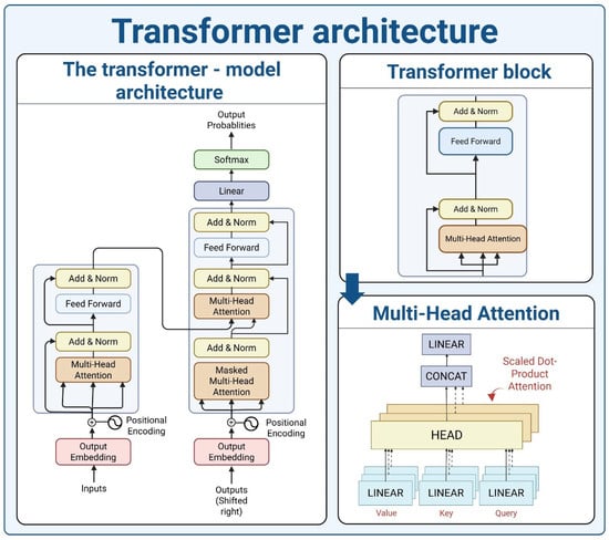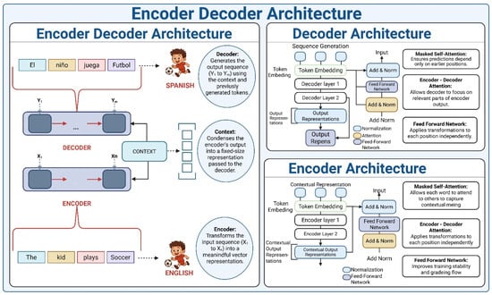 Once encoded, the input passes through multiple identical layers, each containing a multi-head self-attention mechanism and a feed-forward network [112,115]. Unlike recurrent architectures that process inputs sequentially, self-attention enables the Transformer to evaluate all tokens in parallel, significantly enhancing efficiency [108,109,115]. This mechanism assigns varying levels of importance to different parts of the sequence, allowing the model to capture long-range dependencies effectively [109,115]. After self-attention, each token representation passes through a feed-forward network, which introduces non-linearity and enhances the model’s capacity to learn complex relationships [112,115]. Layer normalization and residual connections are applied within each encoder layer to ensure stability and improve gradient flow, facilitating efficient learning in deep architectures. Figure 3 illustrates a visual overview of the encoder–decoder pipeline, including token embedding, self-attention mechanisms, and feed-forward layers.
