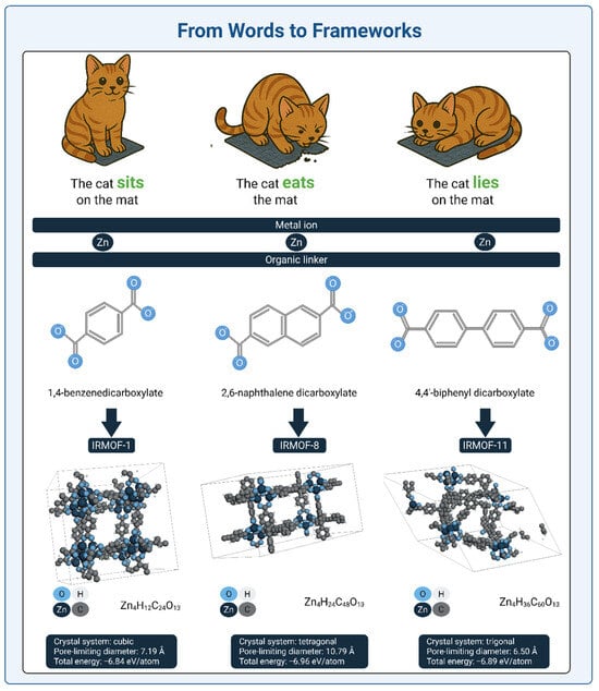 These examples capture the essence of combinatorial semantics in MOF design. Just as the meaning in a sentence is altered by the interrelation of noun, verb, and adverb, the properties of a MOF are defined by the way the metal, linker, and synthesis context interact, not merely by their individual identities [56,169,170]. The crystal system, pore size, and energy landscape are the “meaning” that emerges from the framework’s internal grammar.