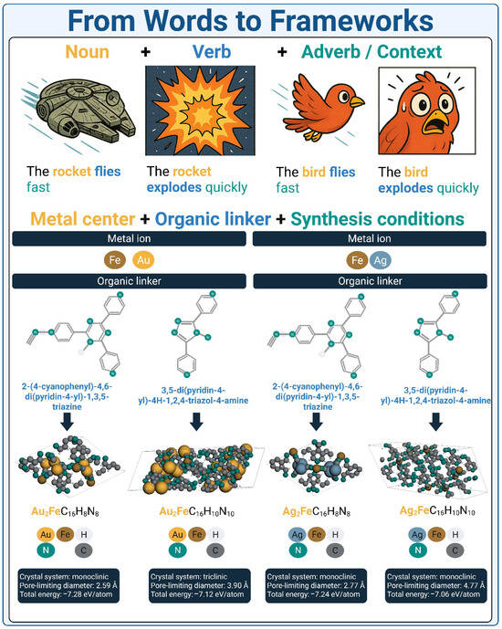 This interplay is not unlike what occurs in natural language. In language, a sentence’s meaning is not the sum of its words, but the result of how those words relate to one another in grammatical and semantic context. For example, “The rocket flies fast” and “The rocket explodes quickly” share structural elements but differ drastically in meaning because of a shift in the verb and adverb. Similarly, in MOFs, changing the organic linker or altering the metal center, even slightly, can result in a completely different material with respect to porosity, stability, or adsorption profile. Thus, the analogy between MOF construction and sentence formation is more than a metaphor; it reflects a shared structural logic grounded in combinatorial rules and contextual dependencies.