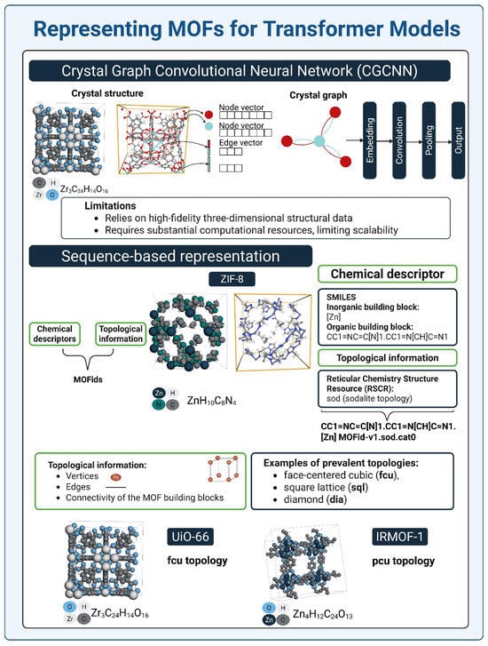 Accurate representation of MOFs is foundational in applying artificial intelligence to materials discovery. Early computational strategies relied on handcrafted geometric descriptors, such as pore size, void fraction, and energy histograms, which provided only limited predictive power [188,189]. While these approaches offered preliminary insights into bulk behavior, they could not capture the complex interplay between local chemical environments and global structural features. This limitation hindered their applicability to advanced AI frameworks, which require representations capable of encoding nuanced, multi-scale relationships within the material’s structure [190,191]. As illustrated in Figure 8, current state-of-the-art MOF representations fall into two complementary paradigms, graph-based and sequence-based, each tailored to the attention mechanisms of Transformer architectures.
