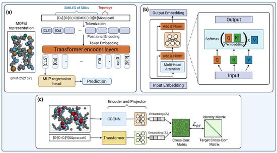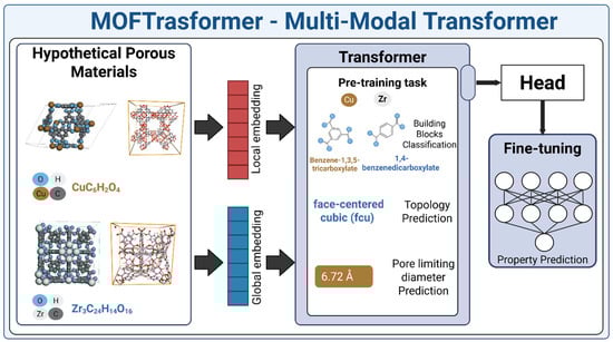 Recent advancements in deep learning have significantly transformed AI-driven materials discovery, with the Transformer architecture emerging as a breakthrough approach [94,95]. Initially developed for NLP, Transformers have redefined computational methodologies in materials science by leveraging self-attention mechanisms to process structured and sequential data efficiently [96,97]. This mechanism allows the model to dynamically weigh the importance of structural features, such as specific metal–ligand interactions or pore connectivity, in a manner similar to how attention mechanisms in language models focus on contextually relevant words in a sentence. Unlike conventional machine learning models, which rely on predefined feature extraction, Transformers dynamically capture complex hierarchical relationships within molecular and crystalline structures, enabling a more nuanced understanding of material properties [98,99,100].