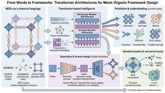 Nanotheranostics, an emerging paradigm that integrates targeted therapy with diagnostic imaging within a single nanoscale platform, has further intensified interest in developing smart and stimuli-responsive nanomaterials capable of performing coordinated biological functions [28,29,30,31]. In recent years, the growing demand for precision nanotheranostics has further highlighted the need for computational models capable of capturing the complex, multiscale behaviors of functional nanomaterials [32,33,34]. Metal–organic frameworks designed for biomedical applications, such as drug loading, controlled release, targeted delivery, and multimodal imaging, display intricate structure–property relationships that depend simultaneously on metal–ligand coordination, pore topology, surface chemistry, and dynamic host–guest interactions [25,35,36]. Traditional machine-learning approaches often struggle to represent these hierarchical dependencies; in contrast, Transformer architectures offer a powerful advantage by employing self-attention mechanisms that identify long-range correlations across atomic, molecular, and crystallographic dimensions [37]. This capability enables Transformers to model adsorption energetics, framework flexibility, diffusion pathways, and functional group interactions with unprecedented fidelity, supporting the rational design of MOFs for applications in drug delivery, biosensing, and integrated diagnostic–therapeutic modalities [38,39].