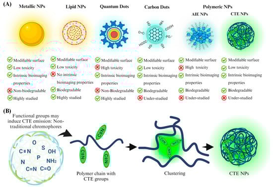 Recent research efforts are focusing on the development of fluorescent theranostic agents only based on biocompatible and safer polymers, aiming to balance imaging capabilities with minimal toxicity. Cluster-triggered emission (CTE) polymers represent a promising advancement in the field of nanotheranostics [28,29,30,31]. Cluster-triggered emission (CTE) is a phenomenon where the fluorescence intensity of polymers significantly increases upon the aggregation of different subunits within the polymer chain, similar to AIE systems. However, AIE and CTE are distinct chemical mechanisms with different requirements, underlying principles, and applications. AIE involves luminophores that are weakly emissive or non-emissive in solution but become highly emissive upon aggregation due to restricted molecular motions (e.g., rotation or vibration), which suppress non-radiative decay pathways. In contrast, CTE arises from the formation of non-covalent molecular clusters, usually made up of non-conjugated molecules containing subunits with n and/or π electrons, such as C=O, NH2, C=N, etc. (see Figure 1B). Fluorescence in CTE systems results from electronic coupling, intermolecular interactions, or hydrogen bonding, based on the through-space interaction (TSI) model. Notably, CTE does not require π-conjugation and can occur in small or simple molecules that are individually non-fluorescent [32,33,34,35].