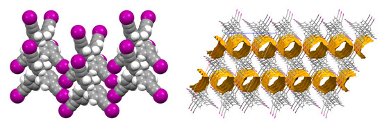 We then tried to grow crystals of I4TEPM and I4TEPA but were successful only with the former. The structural analysis of I4TEPM crystals (harvested from hexanes) showed that the molecules are arranged in stacks which, in turn, are linked together by C≡C–I···(C≡C) halogen bonds, with near orthogonal approach of C–I donors towards C≡C triple bonds (detailed geometrical data are given in Table 1). In each I4TEPM molecule, only two iodoethynyl arms participate in these T-shaped contacts, and the remaining two form weak C≡C–I···π(phenyl) interactions. The extended (and possibly cooperative) zigzag arrays of the C≡C–I···π(ethynyl) interactions ultimately make ladder-like motifs between individual molecular rows, leading to an infinite two-dimensional network (Figure 3 left). I4TEPM shares these packing features with its bromo analog, tetrakis(4-(bromoethynyl)phenyl)methane (Br4TEPM) [42], but not with tetrakis(4-ethynylphenyl)methane (TEPM), which forms an interwoven diamondoid net [44].