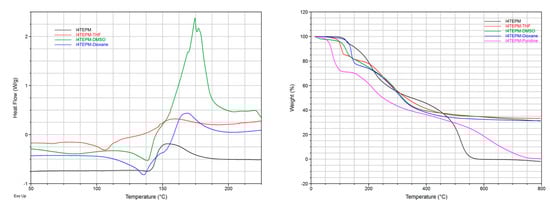 (left) DSC traces (Tzero aluminum pan, 1–2 mg sample size, 5 °C·min−1 heating rate, nitrogen atmosphere) and (right) TGA traces (platinum pan, 5–10 mg sample size, 10 °C·min−1 heating rate, nitrogen atmosphere).