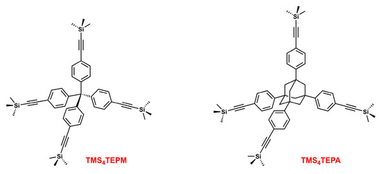 Structural formulas of tetrakis(4-((trimethylsilyl)ethynyl)phenyl)methane (TMS4TEPM) and 1,3,5,7-tetrakis(4-((trimethylsilyl)ethynyl)phenyl)adamantane (TMS4TEPA).