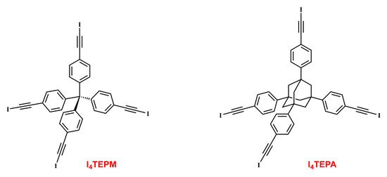 Structural formulas of tetrakis(4-(iodoethynyl)phenyl)methane (I4TEPM) and 1,3,5,7-tetrakis(4-(iodoethynyl)phenyl)adamantane (I4TEPM).