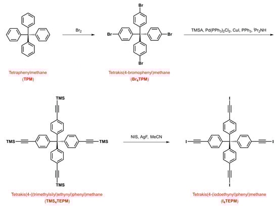Molecular tectonics based on halogen bonding (XB) is still in its infancy [33,34]. We therefore decided to modify the TPM and TPA scaffolds and transform them into new tecton-like entities, tetrakis(4-(iodoethynyl)phenyl)methane (I4TEPM) and 1,3,5,7-tetrakis(4-(iodoethynyl)phenyl)adamantane (I4TEPM) (Scheme 2). When iodine is directly bonded to an sp-hybridized carbon, it is strongly polarized, resulting in a more pronounced electron-deficient region (i.e., σ-hole) at the tip along the C–I bond axis [35,36,37,38]. The iodoethynyl functionality is, therefore, a perfect candidate for σ-hole/XB interactions. Alhough largely overlooked in molecular tectonics and crystal engineering, it can direct the assembly of network structures through C≡C–I···(C≡C) interactions (wherein the ethynyl π system acts as the XB acceptor) [39,40,41]. These T-shaped contacts frequently lead to zigzag chain motifs and are topologically parallel to those formed by C≡C–H···(C≡C) and C≡C–Br···(C≡C) contacts [37,42,43,44,45,46,47,48,49,50,51,52], but preferably serve as a stronger counterpart. Additional features that make the iodoethynyl unit well-suited for devising molecular building blocks include its structural rigidity, steric openness and core expanding ability.