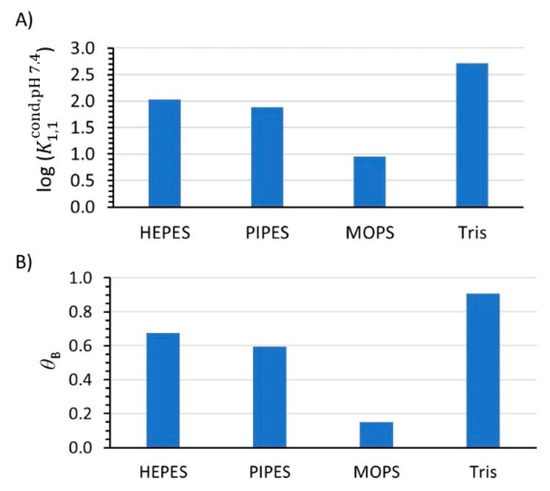 (A) Conditional (or apparent) stability constant for the complexation of silver(I) to the buffer at physiological pH 7.4 (for molecules comprised in their buffer range). (B) Fraction of silver bound to the buffer (total concentration of buffer 20 mM and silver 1 mM) at pH 7.4.