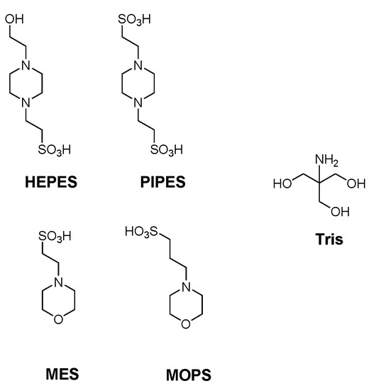 - Ferguson, W.J.; Braunschweiger, K.I.; Braunschweiger, W.R.; Smith, J.R.; McCormick, J.J.; Wasmann, C.C.; Jarvis, N.P.; Bell, D.H.; Good, N.E. Hydrogen ion buffers for biological research. Anal. Biochem. 1980, 104, 300–310. [Google Scholar] [CrossRef]