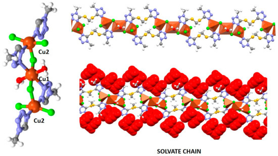 Complex 1 and the solvate 1∙solv crystallize in the monoclinic P21/n and triclinic P-1 space groups, respectively, and they could be considered pseudopolymorphs [19] since they have the same crystalline form, although 1∙solv crystallizes with acetonitrile molecules trapped within the crystal network. Significant structural parameters for compounds 1–1.solv are listed in Table 2 and crystal structure and refinement data are listed in Table S1. Both structures are 1D chains based on a {Cu3Cl6} cluster and the BMTTM ligand, as shown in Figure 1. The three copper atoms in the {Cu3Cl6} unit are aligned with a Cu1–Cu2–Cu1 angle of 180° [20]. The conformation of the outer two coppers is identical. The Cu1⋯Cu2 distance is 3.903 Å in 1 and slightly shorter (3.842 Å) in 1∙solv.