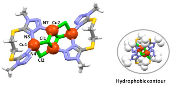 The Cu(I) compound 2 crystallizes in the P21/n space group with an inversion center located between the Cu2 central atoms. Significant structural parameters are listed in Table 3, and crystal structure and refinement data are listed in Table S1. Four Cu(I) atoms and four chloride atoms form a stair-like [Cu4Cl4] cluster core with each of the two BMTTE ligands anchored at each end of the stair through two Cu(I) centers, as shown in Figure 2 [23,24]. In the cluster, the Cu2⋯Cu2 distance of 2.7651(5) Å is slightly shorter than the sum of the van der Waals radii of two Cu atoms (2.80 Å), thus indicating attractive Cu⋯Cu interactions, but the Cu1⋯Cu2 distance of 2.9556(3) Å suggests that copper–copper interactions are not present [25].