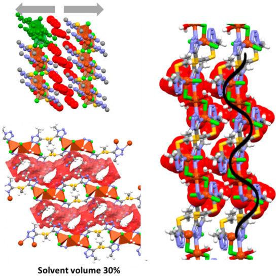 The BMTTM ligand uses three nitrogen atoms of the two tetrazole rings to coordinate three metal centers, as shown in Table 2, with a bridging role that results in the formation of a tape, as shown in Figure 1, with 16-membered macrocycles (Cu2N4S4C6). This macrocyclic motif has previously been observed in complexes with other thioether N-donor ligands [22]. This coordination mode (μ3-1κN3:2κN4:3κN4′) of BMTTM was not observed in the copper-POM complexes, in which the ligand had a bidentate chelating coordination mode with one, two or three copper cations [12,14]. The intermetallic distances through the BMTTM-bridge are 6.97 Å for compound 1 and 6.69 Å for 1∙solv. Moreover, the intramolecular N⋯N distance is shorter in 1∙solv (6.48 Å) than in 1 (6.70 Å). On comparing the two structures, it is evident that BMTTM acts as a semirigid ligand, which shrinks due to the presence of the guest molecules in 1∙solv but retains the same connectivity and geometric environment in both cases. In accordance with this situation, the value of the C–S–C–S torsion angles are 81.78° and 83.20° in 1 and 77.14° and 84.45° in 1∙solv. The chains are achiral and incorporate molecules of BMTTM with opposite helicity in each macrocycle unit.