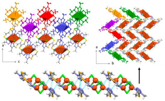 The BMTTE acts as a bis-monodentate bridging (µ-κN2) ligand. This coordination mode is different to the bis-monodentate bridging mode observed in some copper-POM complexes, where the nitrogen atom involved in coordination is N3 [11,12] and not N2. The S–C–C–S torsion angle is 180° and each metallocycle contains two ligands of opposite chirality to yield an achiral layer. The distance between two neighboring copper(II) ions through the BMTTE ligand is 14.585 Å and the intramolecular N⋯N distance is 9.794 Å.