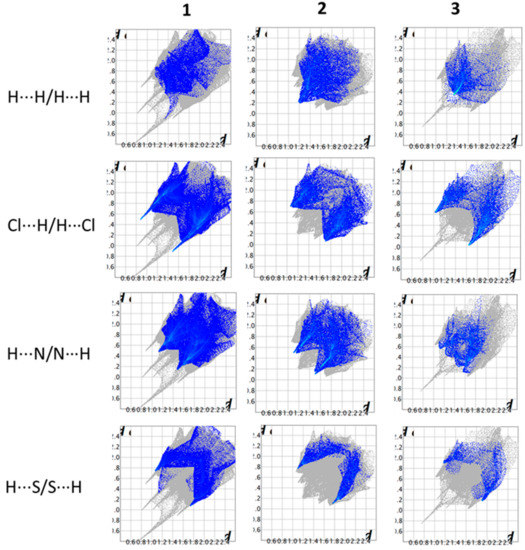 In this approach to assess and visualize the contribution of polar and non-polar interactions to the crystal packing forces, the two-dimensional fingerprint plots for 1, 2 and 3 were delineated for different types of contacts, such as H⋯H, Cl⋯H, N⋯H and S⋯H, as shown in Figure 8. The decomposition of contributions from different interaction types proved to be helpful to highlight graphically the surface regions that are involved in a specific type of intermolecular contact. The visual analysis of the different fingerprint plots show that the molecular environments are clearly different in each compound.