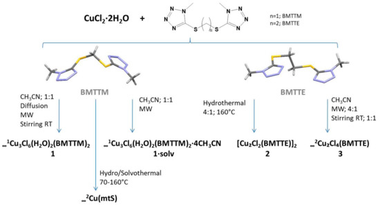 The study of the reactivity in the CuCl2/BMTTM or BMTTE system was performed using different stoichiometric ratios and four synthetic methods: stirring at room temperature, diffusion, reflux under microwave irradiation and hydro/solvothermal techniques. Conventional synthesis at room temperature afforded the compounds in good yields. However, hydrothermal and microwave methods, providing the same compounds in lower yields, were used to synthesized compounds as pure materials and as single crystals. Acetonitrile was used as the solvent for the reactions due to the better solubility of the ligands in this solvent. The synthetic conditions allowed the preparation of the crystalline complexes 1, 1∙solv, 2 and 3 (Scheme 1).