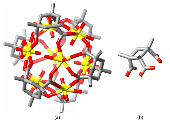 When uranyl ion and H2cam are reacted in the presence of 1,4-diazabicyclo[2.2.2]octane (DABCO), however, the bent arrangement does appear to have the desired effect in that in the crystal of [(UO2)8{(cam)12H8}]·12H2O, (F, CSD refcode MUNKOW), an octanuclear cage species (Figure 5a) with both carboxylate groups bound in the 4-membered, κ2O,O’ chelate mode, is found [81]. This chiral cage has quite large portals and its packing in the crystal results in facing arrays which define channels indicating it might well have 3-dimensional porosity, although this property has not been established. As a neutral species, the cage might be expected to be able to encapsulate neutral small molecules but the resolved water molecules of the structure are found either on the faces of the cages or in between cages, where H-bond acceptor sites are most abundant. That the cage has significant stability is indicated by the fact that it can be crystallised in its fully deprotonated form as Ba(II) [81] and K(I) [80] derivatives (CSD refcodes MUNKUC and LIYRAO), although here the channels are now blocked by the counter cations. This could mean, nonetheless, that the complexes might be used as ion-exchange materials but the fact that in the presence of NH4+ and CH3PPh3+ cations, camphoric acid and uranyl ion react [79] to give crystals of composition [CH3PPh3]3[NH4]3[(UO2)6(cam)9], (G) (CSD refcode JIVBOI), containing a hexanuclear cage complex (Figure 5b) in which a phosphonium cation occupies the cage, indicates that any such capacity would be limited. It also must be noted that although luminescence measurements have not been made on all these complexes, where they have [79,80], uranyl ion emission appears to be largely, if not completely quenched, indicating a limited potential for photo-oxidation catalysis. In some instances, while uranyl ion emission is not observed or is weak, broad-band emission of obscure origin is observed, providing yet another indication that the photophysics of uranyl ion complexes in the solid state is yet to be fully understood [61,84,85].