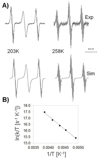 The intensity distribution of the EPR lines is strongly dependent on the temperature. The triplet almost reaches a 1:2:1 intensity ratio at 258 K. However, it reversibly alters with lowering the temperature. At 203 K (before the solution freezes), the central line becomes markedly broadened (Figure 2A, left). These alternating line widths can be traced back to electron localization/delocalization phenomena between the two equivalent, non-conjugated 2-en-1-one moieties. At high temperatures, the exchange between the two topologies of Scheme 1 is faster than the time resolution of the experiment, thus the two 2-en-1-one moieties feature identical spectral properties (electron delocalization). At low temperatures, however, the exchange rate reaches the EPR time scale and the electron localization starts being detectable. Using a two-jump model for electron delocalization (see Methods), the experimental EPR spectra can be simulated. An Eyring–Polanyi plot (Figure 2B) of ln(k/T) (with k = 1/τ, where τ is the lifetime of the localized state) versus 1/T yields an activation enthalpy of 3.8 kcal mol−1 and an activation entropy of 2.3 cal mol−1 K−1, matching those for similar previously-studied systems []. In that study, electron delocalization was explained by a mechanism of counterion decomplexation from one side and recomplexation at the other side. The positive activation entropy was attributed to the increased flexibility of the two ions in the intermediate, unbound state. Such an interpretation neglects, however, the decrease of the solvent entropy upon dissociation of ionic particles.