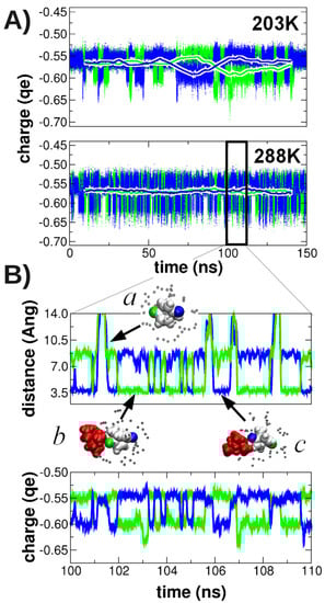 With Eyring’s equation [], we find that the decrease of the temperature from 288 K to 203 K decreases the exchange rate by a factor of about 15. Thus, the passage time for the solvent-caged transition should increase from 270 ps at 288 K to about 4 ns at 203 K. Indeed, the simulation at 203 K reveals transition times on this time scale (Figure 3A) in agreement with the corresponding EPR line broadening upon lowering the temperature.