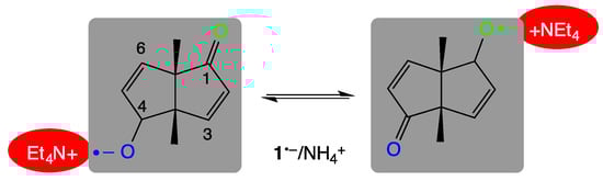 It is tempting to discuss the formal charge exchange between the two 2-en-1-one moieties of radical anion 1•– in terms of an intramolecular electron transfer, especially owing to laureate’s milestone contributions in this field [,]. In our case, the transfer is between a donor and acceptor state with identical free energy. The rate-limiting step is the reorganization of the chemical environment (counterion). Marcus’ theory [] would yield a reorganization energy λ of about 12.5 kcal mol−1 (ΔG# = 3.1 kcal mol−1 = λ/4 because ΔG = 0). However, electron transfer theories rely on the fact that the transfer rate is controlled by vibronically coupled events, and that there are now slow gating processes that are rate-limiting. The latter applies to our case though. The negative charge is gated by the solvent-caged exchange of the positively charged counter ion. Thus, the formal charge transfer between the two 2-en-1-one moieties is probably best described by conventional transition state theory (Eyring’s equation), as is done above.