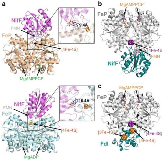 Docking models for reduction of the Fe protein by NifF and Fdx (FdI). (a) MgAMPPCP-Fe protein (top, PDB: 4WZB) and MgADP-Fe protein (bottom, PDB:1FP6) interacting with NifF (PDB:1YOB). (b) MgAMPPCP-Fe protein (PDB:4WZB) interacting with NifF (PDB:5K9B) and (c) FdI (PDB:6FDR). Hypothetical electron transfer distances between the [4Fe-4S] cluster of the Fe protein (NifH) and the FMN cofactor of NifF are shown. Reprinted (adapted) with permission from [9]. Copyright 2020 American Chemical Society. Republished with permission of American Soc for Biochemistry and Molecular Biology Copyright 2017, from [52]; permission conveyed through Copyright Clearance Center, Inc. Adapted with permission from [33]. Copyright 2017 John Wiley and Sons.
