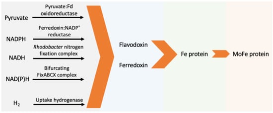 - Edgren, T.; Nordlund, S. Two pathways of electron transport to nitrogenase in Rhodospirillum rubrum: The major pathway is dependent on the fix gene products. FEMS Microbiol. Lett. 2006, 260, 30–35. [Google Scholar] [CrossRef]